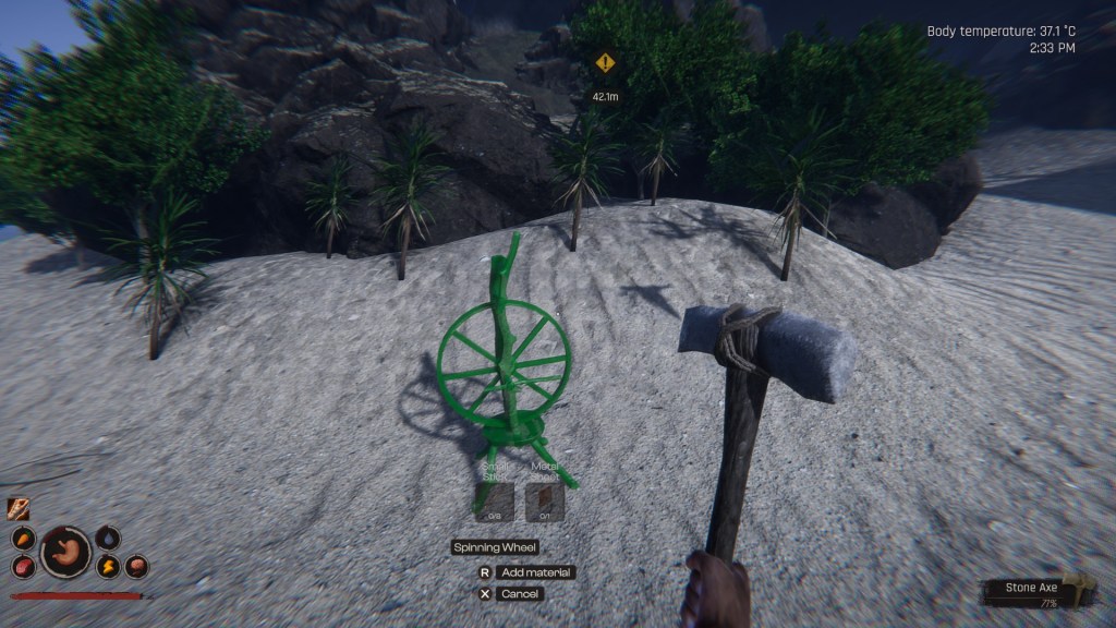 The stone hammer and stone axe are the basic tools required at the end. With the stone axe you will be able to cut down palm trees as well as kill small creatures for meat and materials. The stone hammer on the other hand is required to build structures.