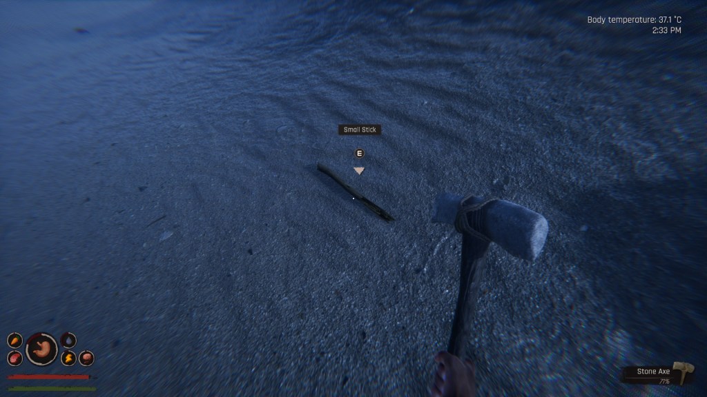 Sticks and rocks and your priority at the start. You will find these scattered along the shores and in the forested area as well. Collect a few as we will need these to create the basic tools that are required to harvest resources and build structures.