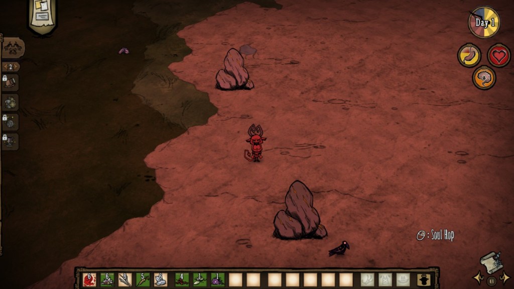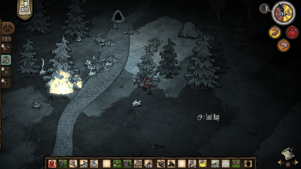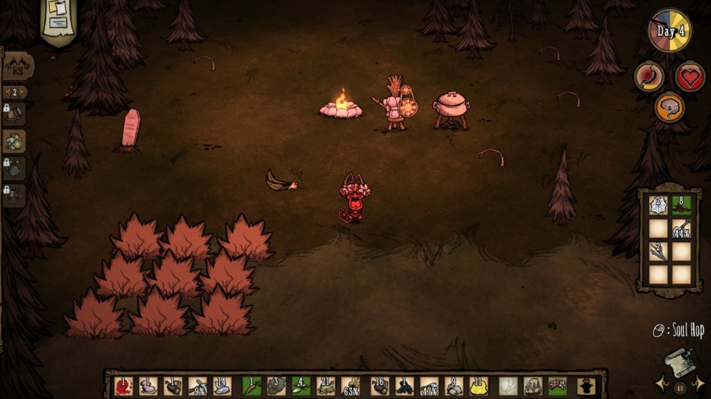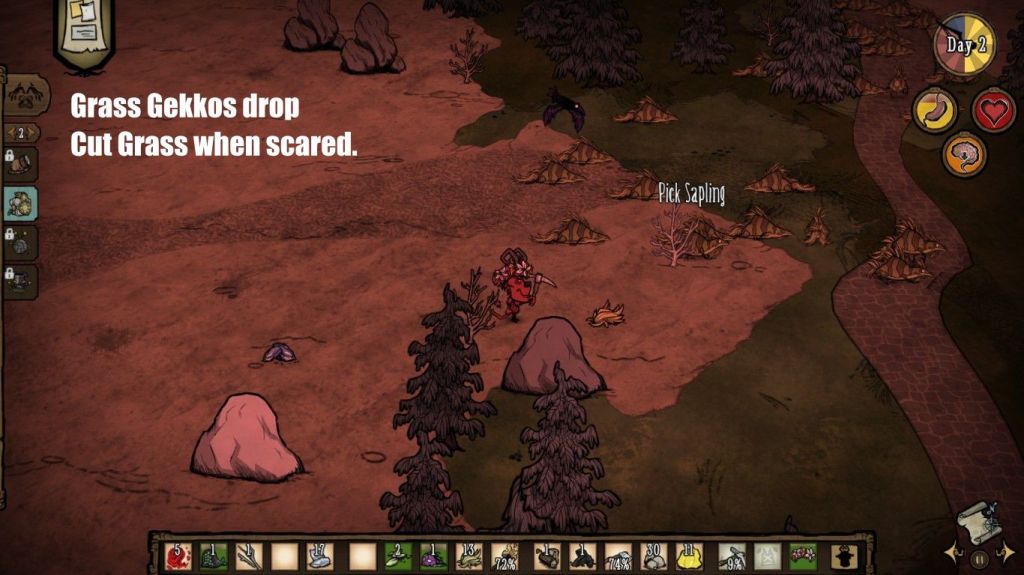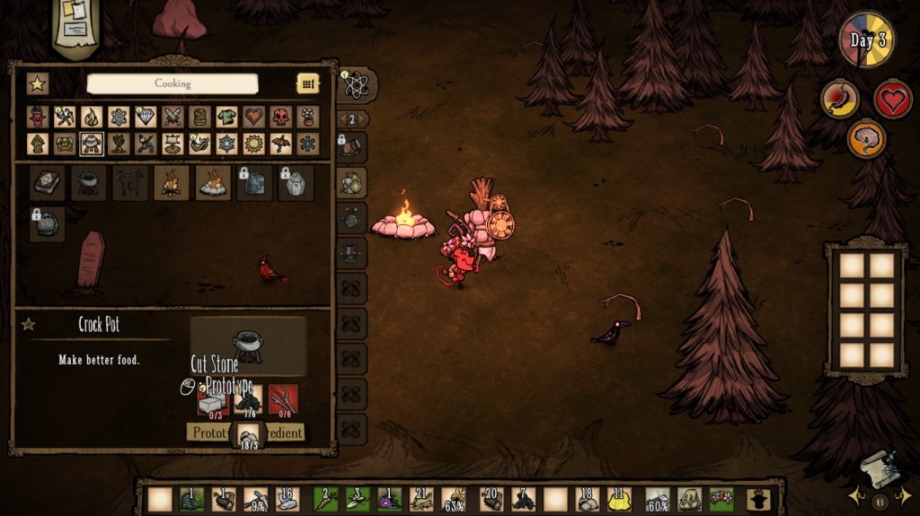 An important note here is that rocks can be carried 3 at a time. Make sure to create the Campfire by accessing the Fire Making section as this will allow you to cook meat that can be harvested by killing turtles or lizards. After building the campfire, open your backpack by pressing ‘TAB’ and then clicking on the arrows on top to access the inner bag space. Here select the meat then hover it over a stone with a circle icon over it, this allows you to place the meat. Next start the fire by repeatedly tapping the ‘F’ key. A timer will show above the meat that has been placed on the campfire. Once cooked make sure to pick it up. Uncooked meat will give the character indigestion or parasites.